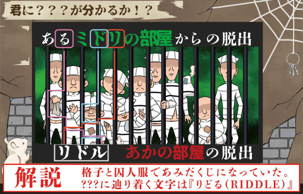 牢獄の格子(縦の黒い棒)が、『あるミドリの部屋からの脱出』の1文字ずつから伸びています!